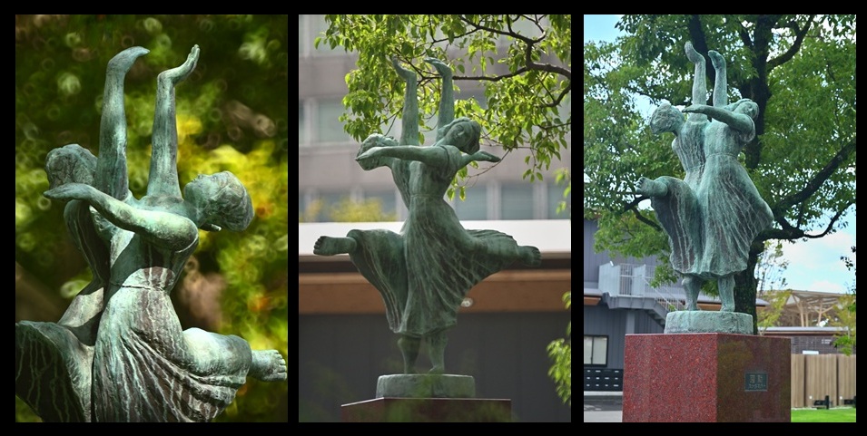横から見ると左右対称の女性像をくっつけているような感じであるが、天に突き上げた手に勢いを感じ、まさに躍動を感じ、公園に設置するのに適した彫刻であるように感じる。遠くから観ても絵になる。