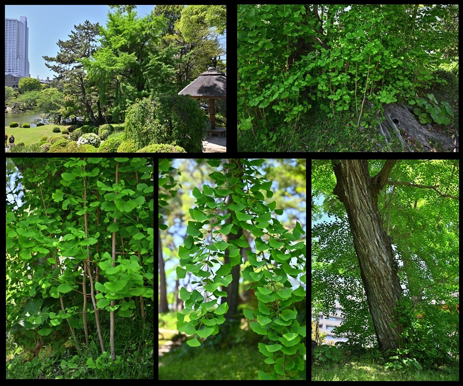 Early summer is over, and the leaf greenery is getting deeper. Many ginkgo nuts were found on the branches extending downward from the tilted trunk. |