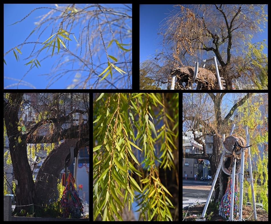 | I photographed this weeping willow as I was shooting cherry blossoms along the Kyobashi River. The dead trunk does not have leaves or flowers, of course, but it looks like it has leaves because the young trees have widely spread branches and leaves. |