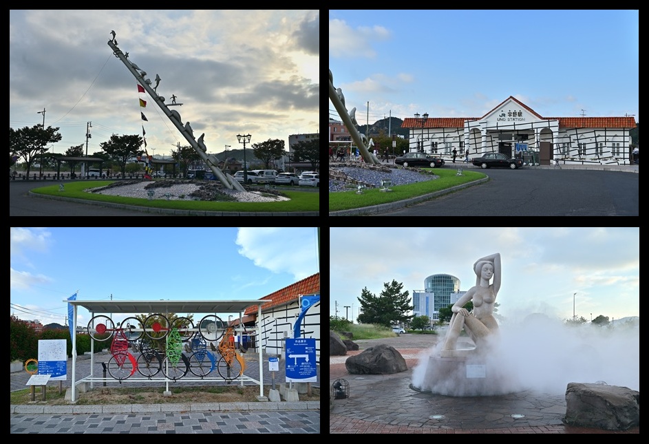 まずは宇野駅へ。宇野駅の駅舎自体がアートになっていて、斜めに黒い線があるので、駅舎自体が斜めになっているようなおかしな具合になっている。 近くに自転車を使った作品もある。駅前のロータリーにも作品があり、斜めに伸びる棒に海の生き物たちが乗っている。 道路を渡ったところには霧の女神の像があり、下から噴き出される霧が周囲を囲んでいる。 海の方に行って駐車場の奥に《宇野のチヌ》とコチヌもある。宇野港にやってきたゴミで作られたもので、小さなチヌの方は中が滑り台になっているので、子供たちが遊んでいる。 スクリューにいろいろなものをくっつけた作品や、虚空から何者かが侵入したような作品もある。夕暮れ時にしてはお客さんが多いような印象である。 駐車場方面に戻る途中にも1個作品があるので立ち寄る。これらは無料で観ることが出来るが、有料のところもある。瀬戸内国際芸術祭をメインで観に来ているなら有料のところも行くのだが、時間もないしホテルを目指す。 |