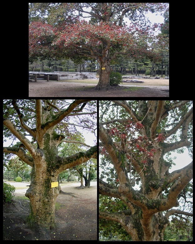 |   広島城には4本の被爆樹木があるが、このクロガネモチは大本営跡の近くにあり、爆心地からの距離は910mである。 主幹には枝が折れた跡なのか、いくつか突起というか三角形の瘤があるのが特徴的である。折れた枝の修復のため膨れたものだろうか?  | |||||||