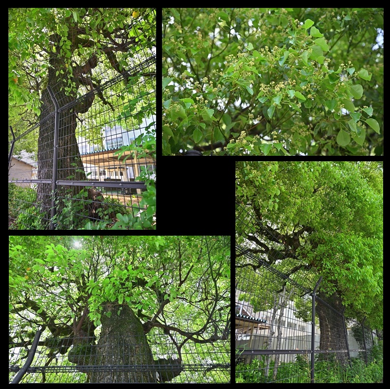 根元は小学校の敷地の北側ギリギリくらいにあるので、フェンスに邪魔されるのと、住宅地にせり出さないように剪定してあるので、北側への発達はなく、南側に流れている。それでもバランスを取るために上の方では北側に張り出してはいる。