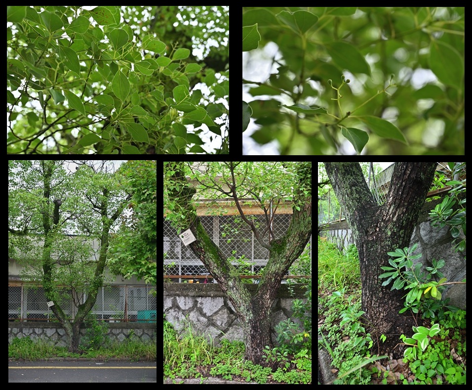 3番目の木が一番細く、1mくらいの所で枝が分岐していたらしいが伐られている。グーグルマップで過去の画像を見ると、赤いテープが巻いてあり、どうも歩行者が当たって危険だということで伐られたのではないだろうか。市街地では仕方ないとは言え、太い枝なので木にとっては大きな負担だとは思う。出来れば小学校側のフェンスを1mくらいは内側に寄せて、枝が伸びる場所を確保できれば良いのだが、現実的には難しいだろう。